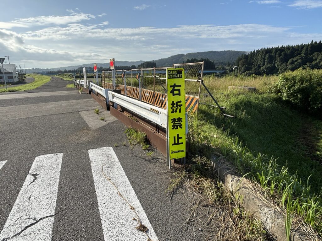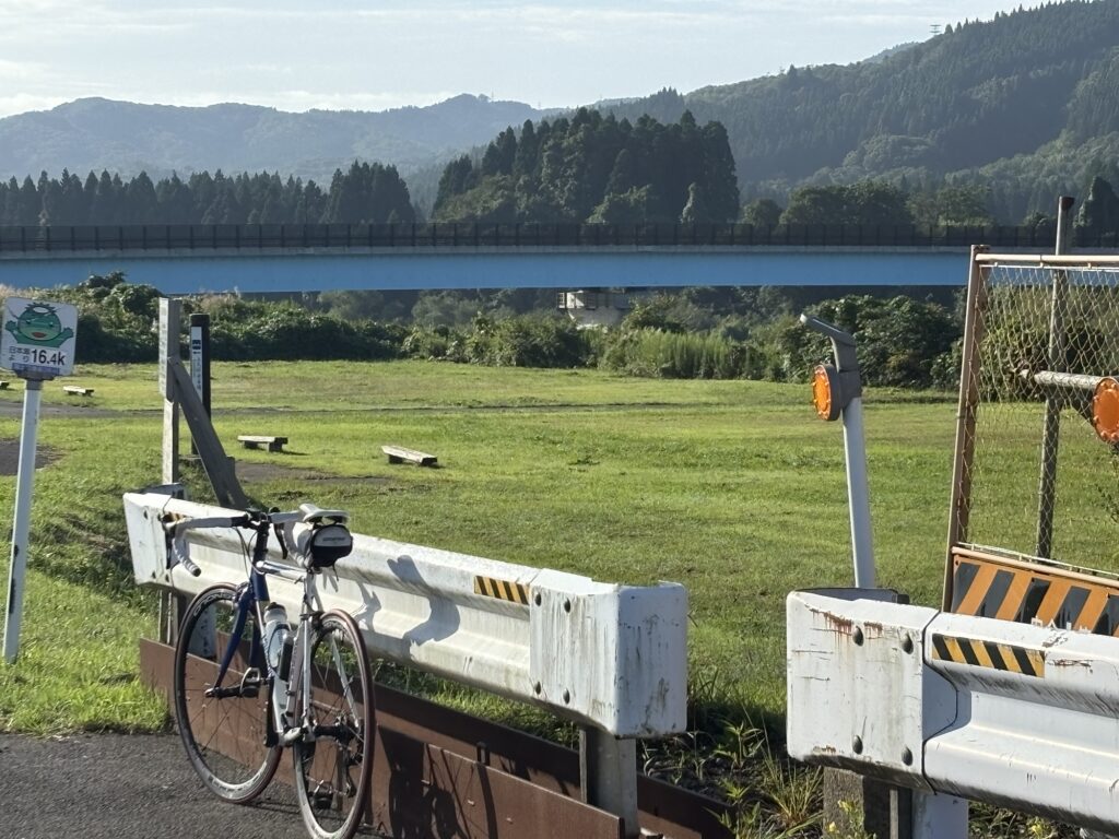 秋田市立豊岩中、豊岩小そばを通る県道65号線で黒瀬橋方面へ。県道65号線に沿って進む。雄物川に架かる黒瀬橋を渡る。雄物川右岸のサイクリングロードで水沢橋へ向かう。
